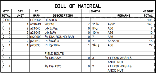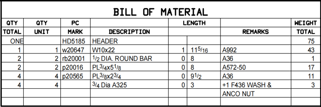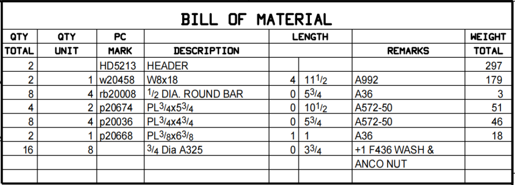 Material Specifications: The BOM must specify the grade of steel for each member, such as ASTM A992 for wide-flange shapes or ASTM A36 for plates and bars. These designations ensure that materials meet the strength and performance requirements established in the project’s structural design.