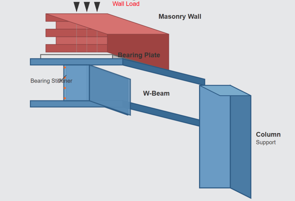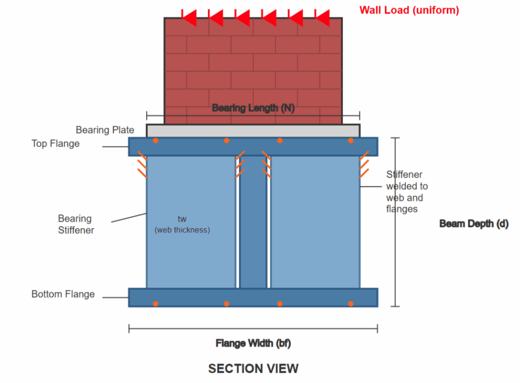Bearing Stiffeners: When concentrated loads from walls exceed the web’s local yielding or crippling capacity, bearing stiffeners must be provided. These are typically fabricated from plates welded to the beam web and flanges.